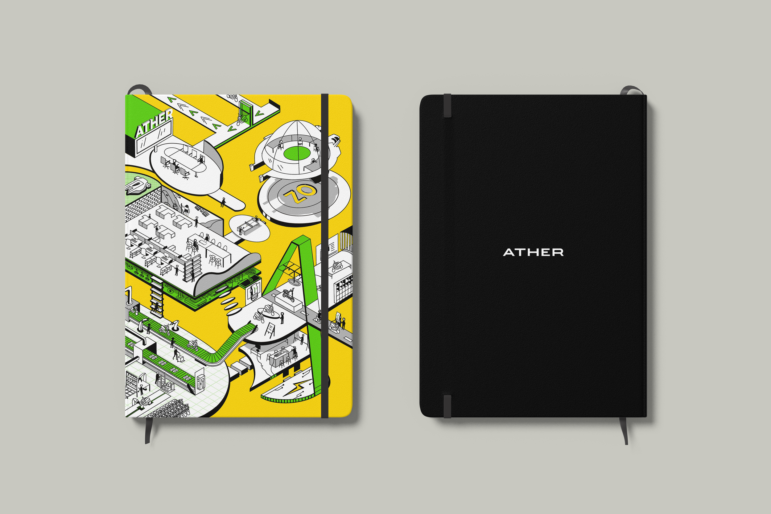 The new joiner kit included a T shirt, water bottle, notebook, stickers, and a packaging design. While all elements relate to their brand values, the notebook depicts the Ather org structure showing the factory level, the corporate office, the experience centers and zonal office.